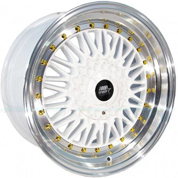 16x8 MST MT13 White w/ Machined Lip Gold Rivets 5x100 5x4.5/114.3 20mm