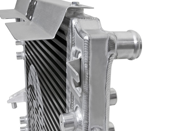 Brushed aluminum finish with an aFe Power logo painted on the front. Radiator hoses are finished in black silicone with an aFe Power logo printed on them.