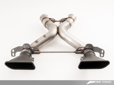 The exhaust is constructed from mandrel bent 304 stainless steel at 3” diameter throughout and features a small balance opening between the banks to produce the a desirable and exotic tone. The AWE Tuning Performance Exhaust features logo tips evoking the factory geometry in a discrete satin black finish, or a less subtle bare stainless steel machined finish.