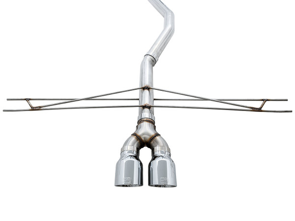 The Touring and Track Edition Exhausts include a 3” frontpipe that is designed and sized accordingly to mate to the factory downpipe or any downpipe designed to mate to the factory exhaust. This frontpipe is integrated into the design of the exhausts. AWE exhausts are not designed to mate with other aftermarket frontpipes.