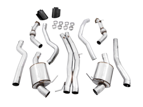 Complete AWE Touring or Track Edition Exhaust, AWE valve simulators, two RS-style oval tips, and all required hardware for installation.