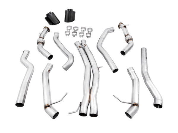 Complete AWE Touring or Track Edition Exhaust, AWE valve simulators, two RS-style oval tips, and all required hardware for installation.