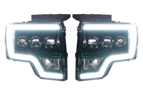 No Substitutes: If you're still running oldschool halogen headlights on your F150, then you're just behind the times! Thankfully the new Morimoto XB LED headlights: Look great. Are well-built. Have a virtually infinite life span. An unbeatable warranty, and out-perform the alternatives. Easily making them the best LED headlights on the market today for the F150 aftermarket OEM Plus: At we we live, eat, and sleep headlights. While the F150 LEDs from Morimoto cost a bit more relative to other options in the aftermarket; as the saying goes "you pay for what you get". We've seen it all, and their fit and finish is far superior to everything else out there. Guaranteed. Performance: We've always been blown away by the fact that the other brands don't even consider how well their headlights perform on the road at night. Most often, they're a downgrade compared to even the standard halogen setup, and that's a shame. The good news is that Morimoto's XB LED headlights produce a well defined beam pattern with a great amount of width, intensity, and a proper distribution of light. DOT Approved: Make no mistake, these will produce a much different [better] result than slapping some LED replacement bulbs into your stock housings. Their triple-projector optics meet & exceed all SAE, DOT, and FMVSS108 regulations when aimed properly...and that's easy to do with their integrated vertical/lateral adjusters. Plug-n-Play: Wiring is easy too! The LED headlights are designed to work on your Ford F150 without any modifications. They will plug into the factory connectors for the stock headlights and each assembly includes all necessary connectors, rubber seals, and pigtails for a plug n play install. No error codes, no flickering, hyper-flashing, or radio interference. They can easily be removed, and will not void your factory warranty. Sequential LED DRL: Game Changer! Their LED daytime running light is powered by Osram 5000K LEDs and is insanely bright, easily visible during the day. A separate optic that's dedicated to the turn signal function uses amber LED's to produce a full sequential turn signal. While that feature will cause others to mistake your truck for an Audi; for those who are a bit more traditional they can also be setup to run as solid on/off style signals too. Well-Built: Their UV-coated polycarbonate lens will resist the test of time, ensuring your truck's new headlights will look good as new for many years to come. The PPS plastic housing is light-weight and much stronger than comparable alternatives. The die-cast aluminum heat-sinks inside the housings provide more than an adequate amount of cooling for the OEM grade Osram LED chips that produce the light. These complete headlights may be new to the market, but Morimoto's XB LED fog lights have proven themselves perfect after 5+ years out now, which is confidence inspiring. They Look: Amazing. At least in our opinion! The subtle elements incorporated in their design are more than enough to make them stand out, but they're clean enough to be considered top of the line original equipment to those who don't know any better. The piano black trim and smoked gray reflectors keep the color scheme neutral, and the Bi-LED kuria-optic projectors are as modern as it gets.