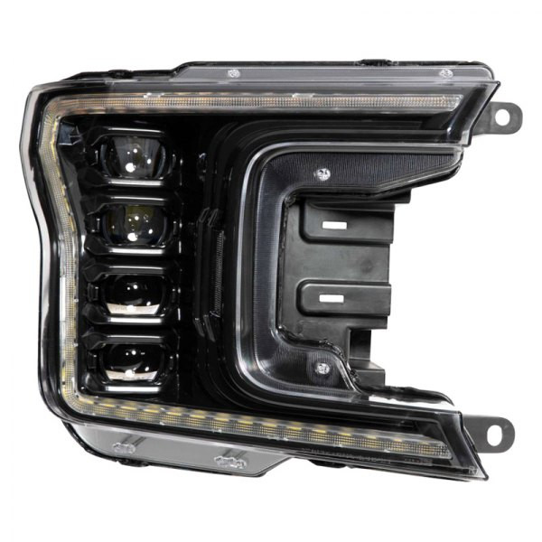 No Substitutes: If you're still running oldschool halogen headlights on your 18-20 Ford F150, then you're just behind the times! If you're running a set of different aftermarket headlights, well, these should make you second guess that decision. The second gen Morimoto XB LED F150 headlights: Look amazing. Are well-built. Have a virtually infinite life span. An unbeatable warranty, and out-perform all of the alternatives. Easily making them the best LED headlights on the market today for the F150. Second Gen Update: The 18+ F150 XB headlights broke the internet when they came out... and while they were the undisputed king for quite a while, other options from brands like Alpharex came out that offered a little more light. In true Morimoto fashion, nothing gets left alone for long and now there is no question: The XB LED Heads for the F150 are back on top, and will be hard to top, period! More Light Output: The original F150 XB heads used two projectors on top for the low beam, and two on the bottom as a dedicated high beam. The new setup utilizes all four projectors for the low beam and has a dual Bi-LED setup for the high beam. The results? 200% more light output and a better distribution of light for improved visibility in the distance and off to the sides of the road. Asked and answered! Start-Up Sequence: And if the optical upgrades weren't enough, the badass start up sequence has been added too. When the Daytime Running light kicks on, the projectors illuminate in a two-stage sequence before turning back off. A video is worth a thousand words here... so make sure to watch the one embedded in the listing to see that in action! While it does absolutely nothing for performance, you can't deny the cool-factor! DOT Approved: Make no mistake, these will produce a much different [better] result than slapping some LED replacement bulbs into your stock housings. Their quad-projector optics meet & exceed all SAE, DOT, and FMVSS108 regulations when aimed properly...and that's easy to do with their integrated vertical/lateral adjusters. US market lights are equipped with amber side markers. Plug-n-Play: Wiring is easy too! The Morimoto F150 LED headlights are designed to work on your truck without any modifications. They will plug into the factory connectors for the stock headlights and each assembly includes all necessary connectors, rubber seals, and pigtails for a plug n play install. No error codes, no flickering, hyper-flashing, or radio interference. They can easily be removed and will not void your factory warranty. Sequential LED DRL: Game Changer! Their LED daytime running light is powered by Osram 5000K LEDs and is insanely bright, easily visible during the day. A separate optic that's dedicated to the turn signal function uses amber LED's to produce a full sequential turn signal. While that feature will cause others to mistake your truck for an Audi; for those who are a bit more traditional they can also be setup to run as solid on/off style signals too. Well-Built: Their UV-coated polycarbonate lens will resist the test of time, ensuring your truck's new headlights will look good as new for many years to come. The PPS plastic housing is light-weight and much stronger than comparable alternatives. The die-cast aluminum heat-sinks inside the housings provide more than an adequate amount of cooling for the OEM grade Osram LED chips that produce the light. These use the same external housing / lens from the gen one version, and those have held up like OEM after a few years on the market. OEM Plus: We live, eat, and sleep headlights. While the F150 LEDs from Morimoto cost a bit more relative to other options in the aftermarket; as the saying goes "you pay for what you get". We've seen it all, and their fit and finish is far superior to everything else out there. Guaranteed. They Look: Amazing. At least in our opinion! The design of the second Gen F150 LED heads was inspired by the OEM LED headlights from the new Ford Expedition. The subtle elements incorporated in their design are more than enough to make them stand out, but they're clean enough to be considered top of the line original equipment to those who don't know any better. The piano black trim and smoked gray diffusers keep the color scheme neutral, and the quad kuria-optic projectors are as modern as it gets.