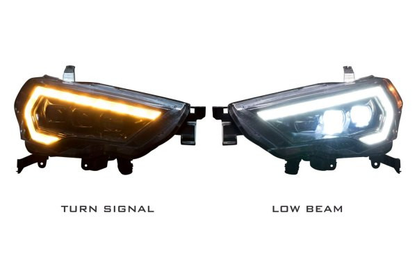 No Substitutes: If you're still running oldschool halogen headlights on your Fifth Gen Toyota 4Runner, then you're just behind the times! Thankfully the new Morimoto XB LED headlights: Look great. Are well-built. Have a virtually infinite life span. An unbeatable warranty, and out-perform the alternatives. Easily making them the best LED headlights on the market today for the 4Runner aftermarket Second Gen Update: The 4Runner XB headlights broke the mold when they came out as the first set of performance aftermarket headlights for the 4Runner... but some early adopters weren't 100% satisfied with the light output. In true Morimoto fashion, nothing gets left alone for long and that's why now the new Gen 2 version is in distribution! More Light Output: The original 4Runner XB's used 2 projectors for low beam, and one dedicated high beam. The new setup utilizes all three projectors for the low beam, and has a dual Bi-LED setup. The results? 33% more light output for low beam mode, 100% more output in high beam mode, and a better distribution of light with more foreground (on the ground directly in front of the truck) for improved visibility while cornering. Asked and answered! Start-Up Sequence: And if the optical upgrades weren't enough, the badass start up sequence has been added too. When the Daytime Running light kicks on, the projectors illuminate in a two-stage sequence before turning back off in. A video is worth a thousand words here... so make sure to watch the one embedded in the listing to see that in action! While it does absolutely nothing for performance, you can't deny the cool-factor! DOT Approved: Make no mistake, these will produce a much different [better] result than slapping some LED replacement bulbs into your stock housings. Their quad-projector optics meet & exceed all SAE, DOT, and FMVSS108 regulations when aimed properly...and that's easy to do with their integrated vertical/lateral adjusters. Plug-n-Play: Wiring is easy too! The LED headlights are designed to work on your Toyota 4Runner without any modifications. They will plug into the factory connectors for the stock headlights and each assembly includes all necessary connectors, rubber seals, and pigtails for a plug n play install. No error codes, no flickering, hyper-flashing, or radio interference. They can easily be removed, and will not void your factory warranty. Sequential LED DRL: Game Changer! Their LED daytime running light is powered by Osram 5000K LEDs and is insanely bright, easily visible during the day. A separate optic that's dedicated to the turn signal function uses amber LED's to produce a full sequential turn signal. While that feature will cause others to mistake your truck for an Audi; for those who are a bit more traditional they can also be setup to run as solid on/off style signals too. Well-Built: Their UV-coated polycarbonate lens will resist the test of time, ensuring your truck's new headlights will look good as new for many years to come. The PPS plastic housing is light-weight and much stronger than comparable alternatives. The die-cast aluminum heat-sinks inside the housings provide more than an adequate amount of cooling for the OEM grade Osram LED chips that produce the light. These complete headlights may be new to the market, but Morimoto's XB LED fog lights have proven themselves perfect after 5+ years out now, which is confidence inspiring. OEM Plus: We live, eat, and sleep headlights. While the 4Runner LEDs from Morimoto cost a bit more relative to other options in the aftermarket; as the saying goes "you pay for what you get". We've seen it all, and their fit and finish is far superior to everything else out there. Guaranteed. They Look: Amazing. At least in our opinion! The subtle elements incorporated in their design are more than enough to make them stand out, but they're clean enough to be considered top of the line original equipment to those who don't know any better. The piano black trim and smoked gray reflectors keep the color scheme neutral, and the triple kuria-optic projectors are as modern as it gets.